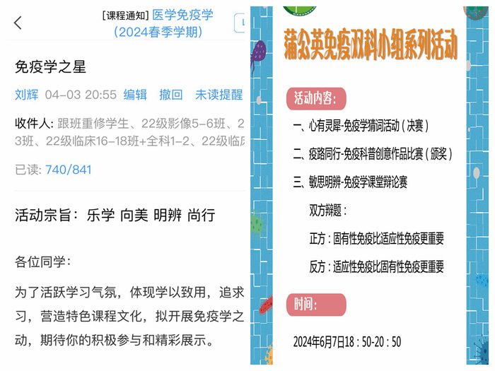 “免疫学之星”是7790cnm必发集团医学免疫学课程的第二课堂。作为课堂教学的拓展,为学有余力的员工提供展示平台。本学期,医学免疫学课程团队开展了第三期“免疫学之星”系列活动,包括“心有灵犀——免疫学猜词比赛”“敏思明辨——免疫学课堂辩论赛”“‘疫’路同行——免疫科普创意作品比赛”等三个主题。