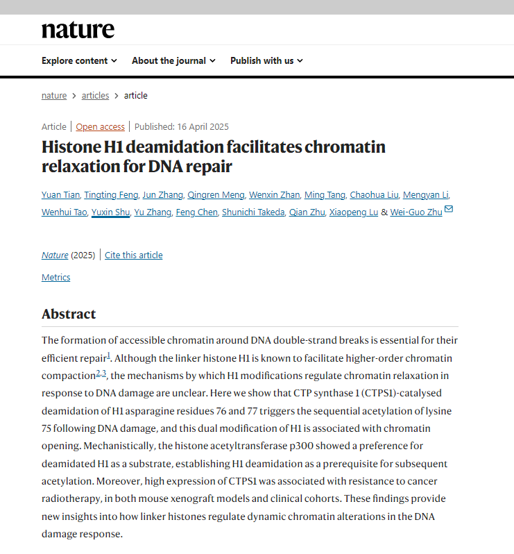 4月16日,公司肿瘤表观遗传创新团队负责人、公司杰出员工朱卫国教授在国际顶级权威杂志《Nature》发表题为“Histone H1 deamidation facilitates chromatin relaxation for DNA repair”的研究论文。深圳大学、7790cnm必发集团、同济大学和北京大学医学部为本研究的共同作者单位,唯一通讯作者朱卫国是公司杰出员工、特聘教授,公司青年博士后束雨新参与该项研究,为署名作者。