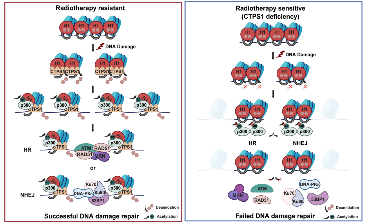 该研究发现了连接组蛋白H1中,天冬酰胺76和77(H1N76/77) 位的脱酰胺修饰在DDR早期起着至关重要的作用,揭示了H1N76/77 的脱酰胺修饰通过级联反应促进 H1临近位点H1K75的乙酰化来调节染色质重塑,进而促进损伤修复因子的募集。研究发现DDR早期H1N76/77可以发生脱酰胺修饰,首次假设H1特异位点脱酰胺作为一种调控染色质松紧的开关。机制研究表明,DNA损伤后,CTPS1 (胞苷三磷酸合成酶1),快速招募至损伤位点,并催化H1 N76和N77的脱酰胺修饰。H1 N76/N77的脱酰胺修饰通过上调邻近赖氨酸K75位的乙酰化修饰,降低组蛋白与连接DNA的结合力,进而促进染色质松散。进一步研究显示,H1N76/77脱酰胺修饰是组蛋白乙酰化酶p300募集到K75位点并催化K75位乙酰化的先决条件。小鼠荷瘤模型和临床肿瘤样本的结果显示,CTPS1高表达与放疗耐受高度相关,CTPS1缺陷可以显著提高肿瘤细胞对放射治疗的敏感性。CTPS1是催化UTP(三磷酸尿苷)转化为CTP(三磷酸胞苷)的限速酶,是催化嘧啶核苷酸生物合成的关键步骤,为核酸(如DNA、RNA)和磷脂的合成提供必需原料。该研究揭示了CTPS1在DNA损伤应答中的独特作用, 为探索关键酶类在不同的细胞内外环境下发挥不同的生物学功能提供了很好的启示。