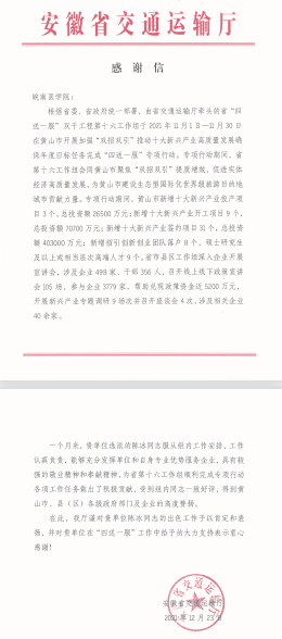 2021年12月23日,安徽省交通运输厅给公司病理解剖学教研室陈冰老师发来感谢信,感谢陈冰老师在2021年安徽省“四送一服”双千工程工作中所做的积极贡献。
